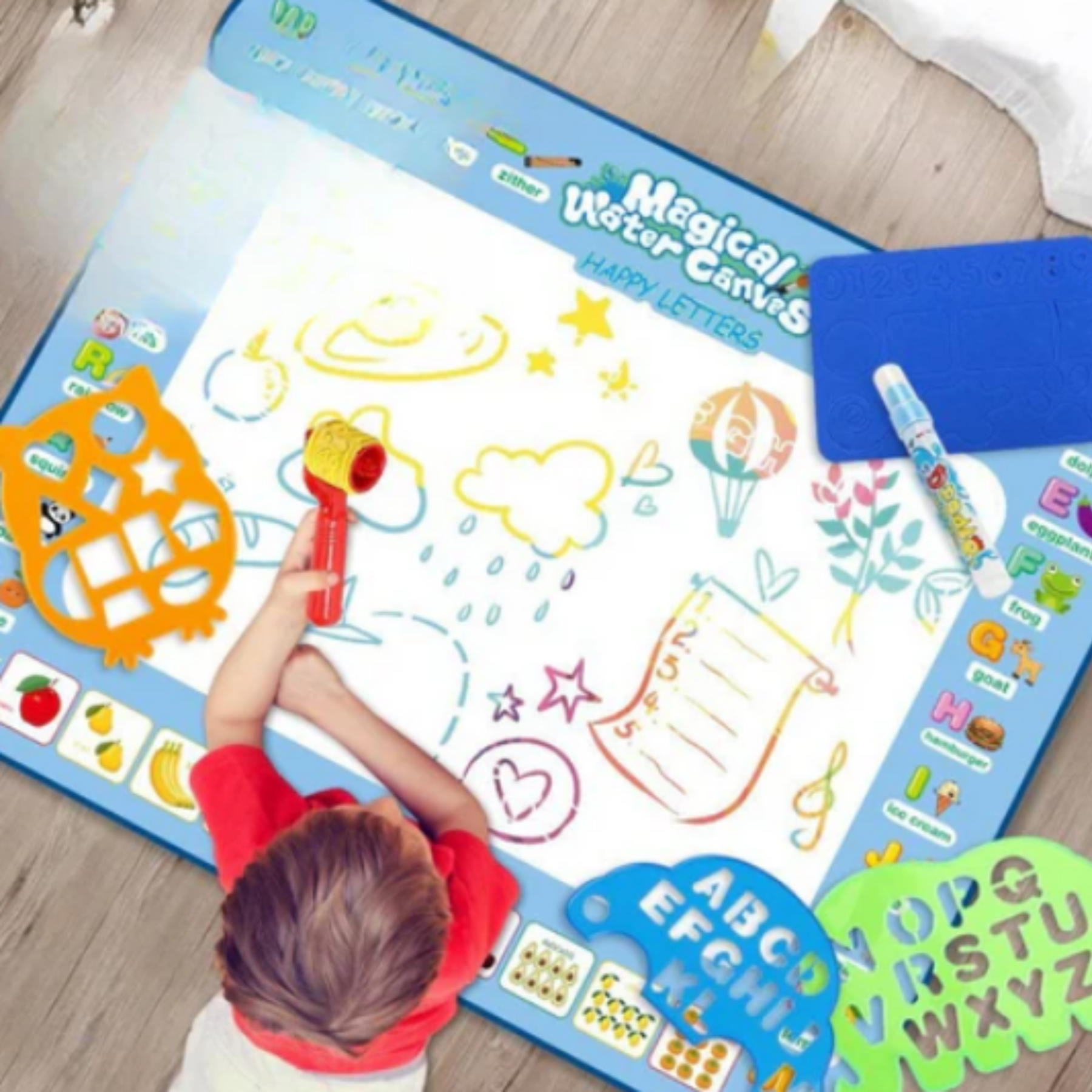 Los niños pueden dibujar utilizando un bolígrafo especial con agua, sin pinturas ni tintas. Esto permite que jueguen con total tranquilidad sin preocuparse por manchas en la ropa, muebles o paredes.